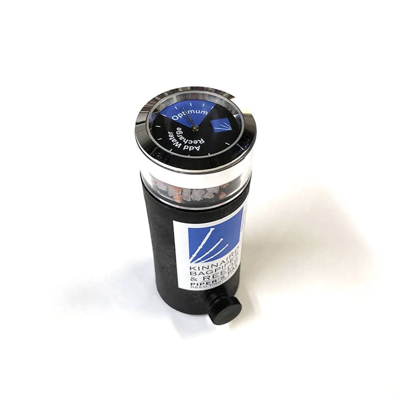 Kinnaird Bagpipes is pleased to announce Piper’s Pal Alert Reed Protector! Over 15 years ago, Kinnaird Bagpipes patented the design of the world’s first humidity control system for the storage of cane bagpipe reeds. This invention revolutionized how pipers store and maintain their cane reeds. Tens of thousands of reed protectors have been sold over this time, and are used by pipers and bands at all levels. The Piper’s Pal Alert is an update to the original reed protector design that incorporates an indicator on top of the reed protector to visually show when it is operating at optimum conditions, and when it needs to be recharged.